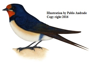 Golondrina Tijereta Hirundo rustica.- 14 -16,5 cm, dependiendo de la longitud de las timoneras. Encima es azul acerado lustroso brillante; frente, garganta y pecho de color rufo obscuro, bordeado por un color azul negruzco, el resto de la parte inferior es color acanelado. Su cola es larga y claramente bifurcada, más corta en juveniles y adultos en época de muda.