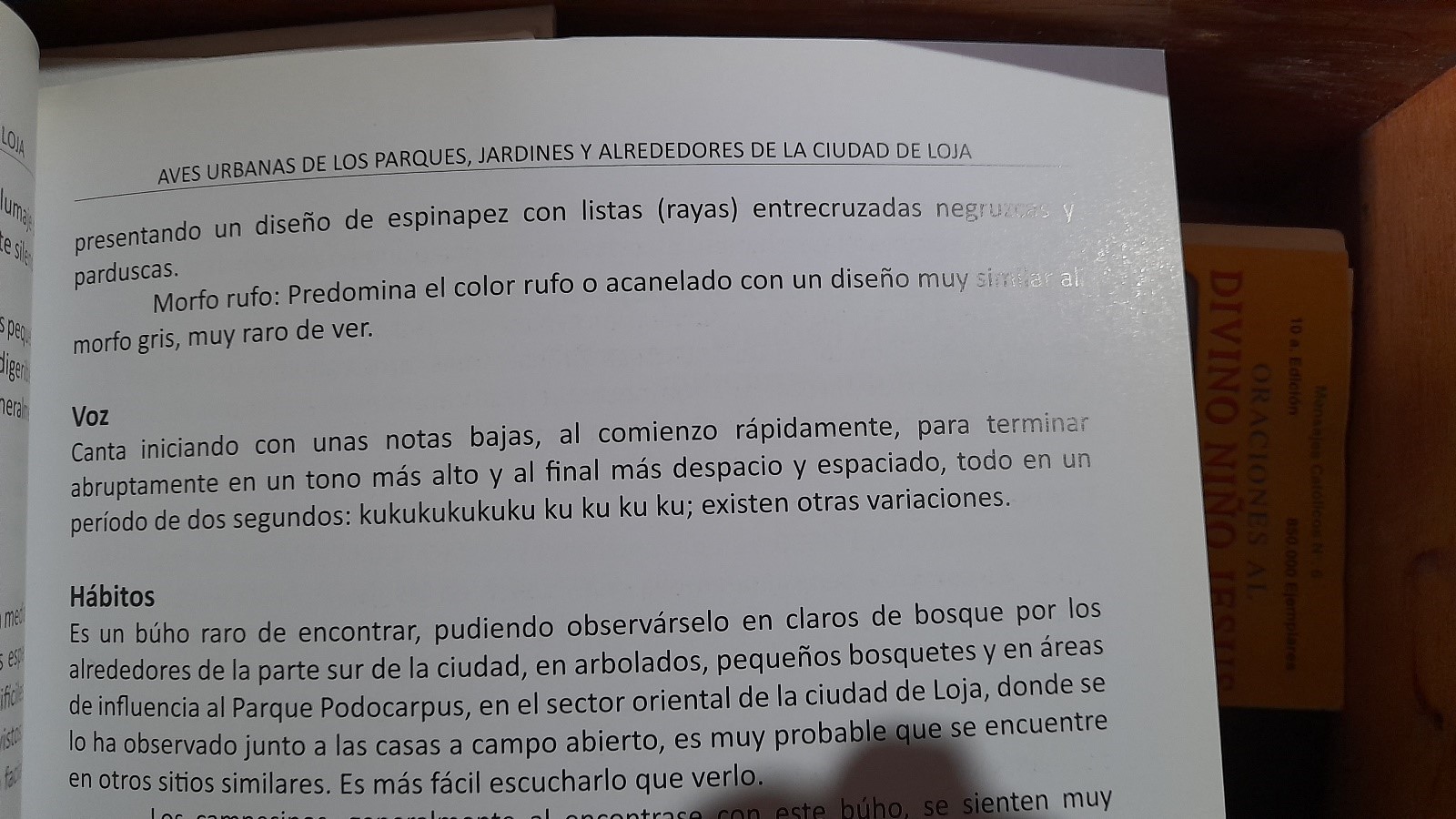 Pasados los años publique un pequeño aporte para el conocimiento y la protección de las aves: el libro Aves Urbanas de Loja, de mi autoría; la describí como la especie Otus roboratus del Sur del Ecuador de acuerdo al libro Aves del ecuador para las tierras bajas en el bosque seco. Lo que siempre dudé de esta especie fue su canto, ya que comparando el canto del búho registrado en la ciudad de Loja con el canto de Megascops roboratus del libro Aves del Ecuador, nunca correspondía, y era muy diferente. En mi descripción de la voz para la especie, lo hice en base a la registrada y grabada en la ciudad de Loja la cual claro difiere a la del Megascops roboratus. Siempre hubieron obvias razones para pensar que era un diferente Búho porque su voz era diferente la cuál era motivo para resolverse en algún momento.