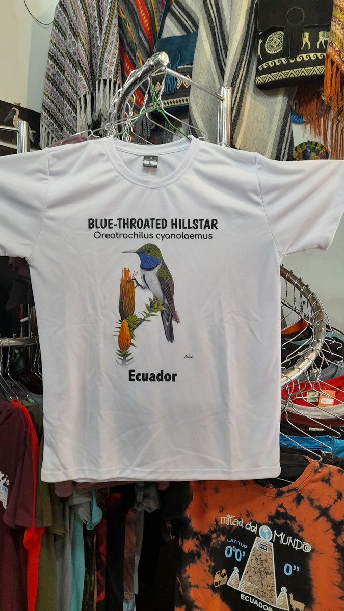 This beautiful himmingbird was discovered in 2017 in southern Ecuador, in the province of Loja, Saraguro, place Cerro de Arcos. For those people who are visiting southern Ecuador, and would like to carry a nice memory of this bird, we offer this wonderful souvenir embodied on a t-shirt, which the original painting was made by the bird illutrator Pablo Andrade. This hummingbird was made in oil on canvas and it was painted in a realistic way with many hours of work.