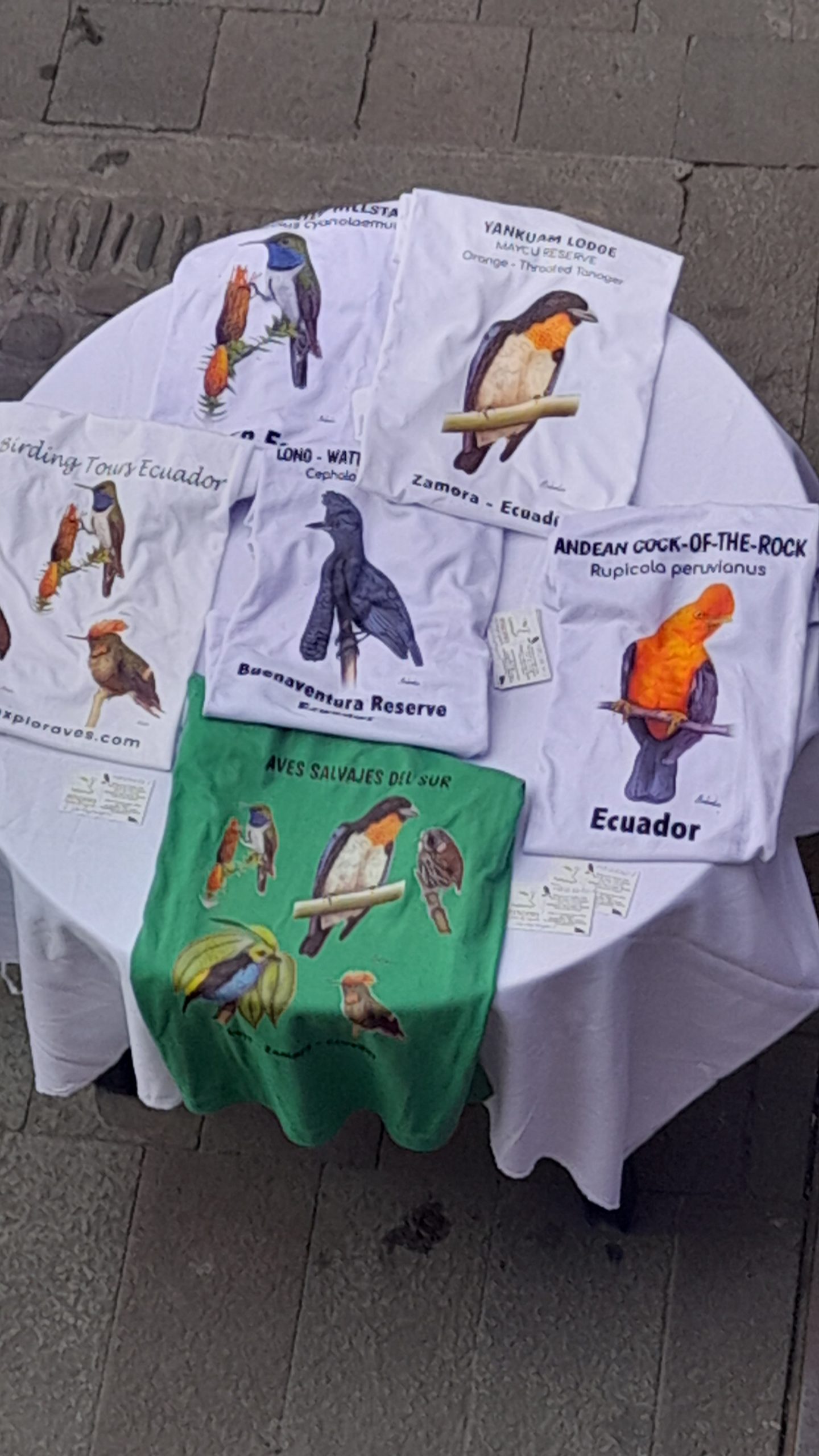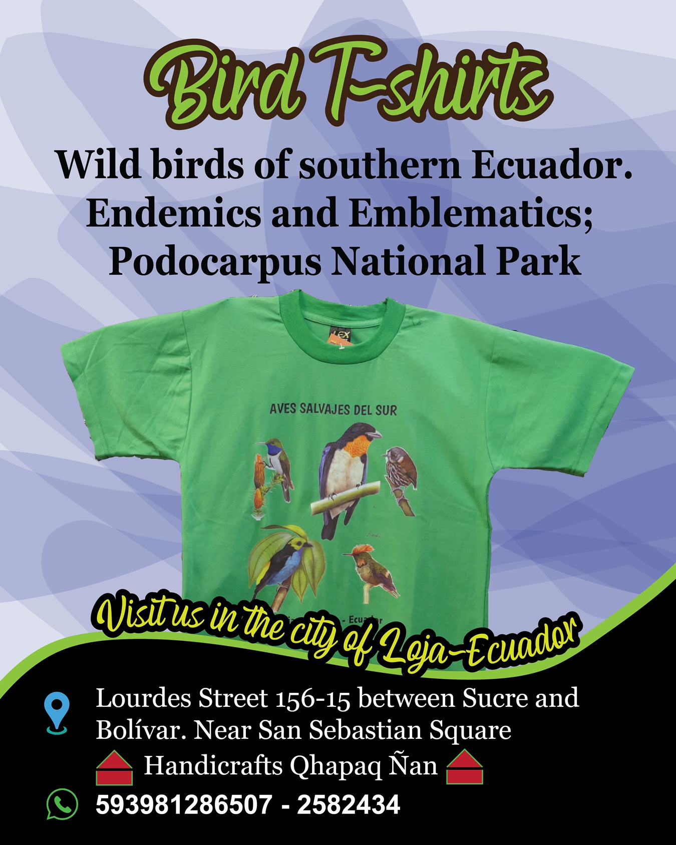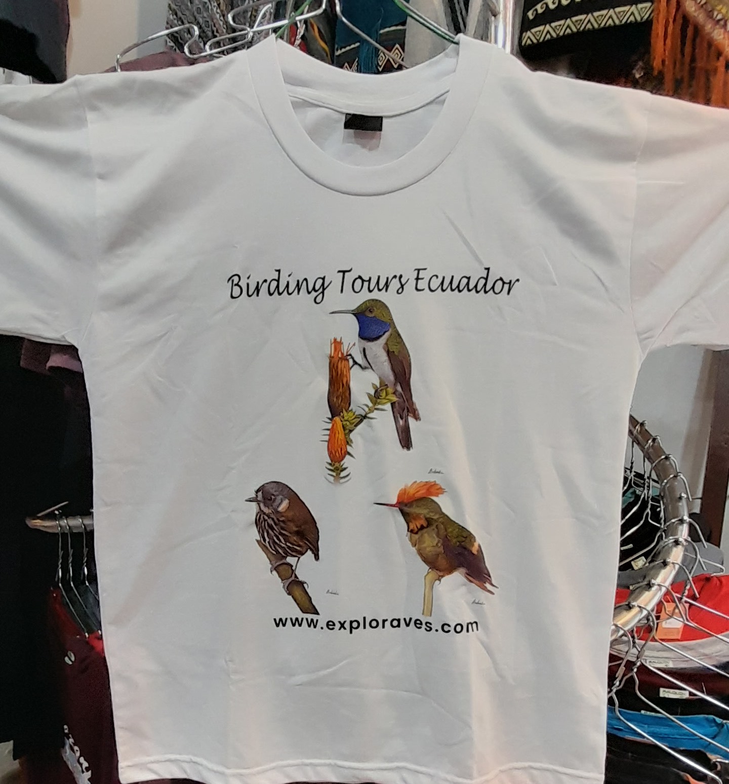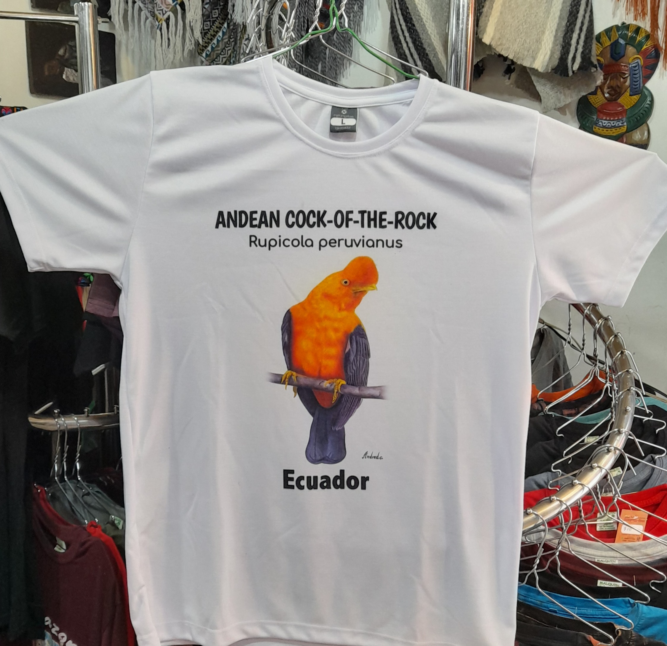 T-shirts printed with original illustrationes made By Pablo Andrade. We can custom designs with all the birds of the city of Loja as well as the wild birds of Southern Ecuador and Podocarpus National Park, endemics and emblematics such as the Blue-throated Hillstar, Long-wattled Umbrella Bird, Andean cock-of-the Rock, Orange-throated Tanager, Spangled Coquette, Crescent-faced Antpitta, Koepcke´s Screech Owl and many other amazing colorfull birds