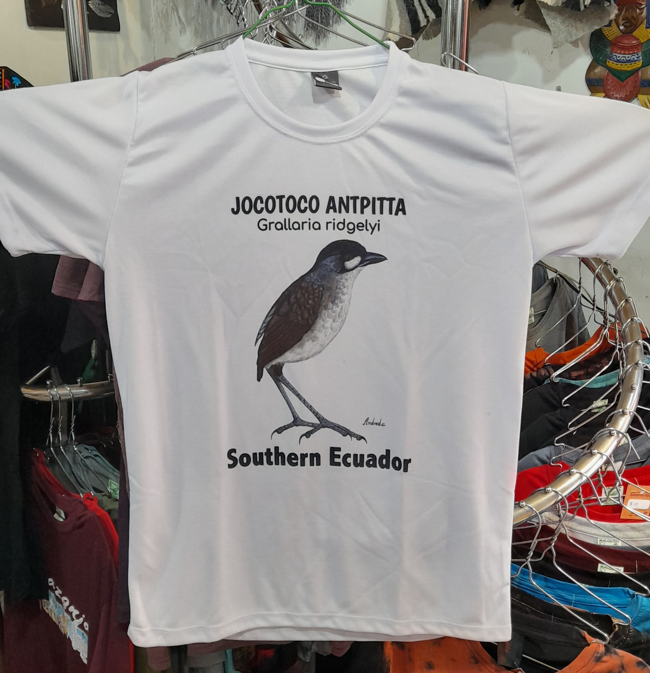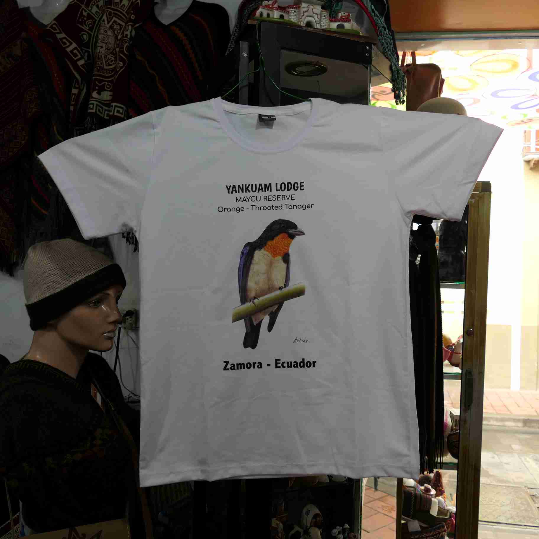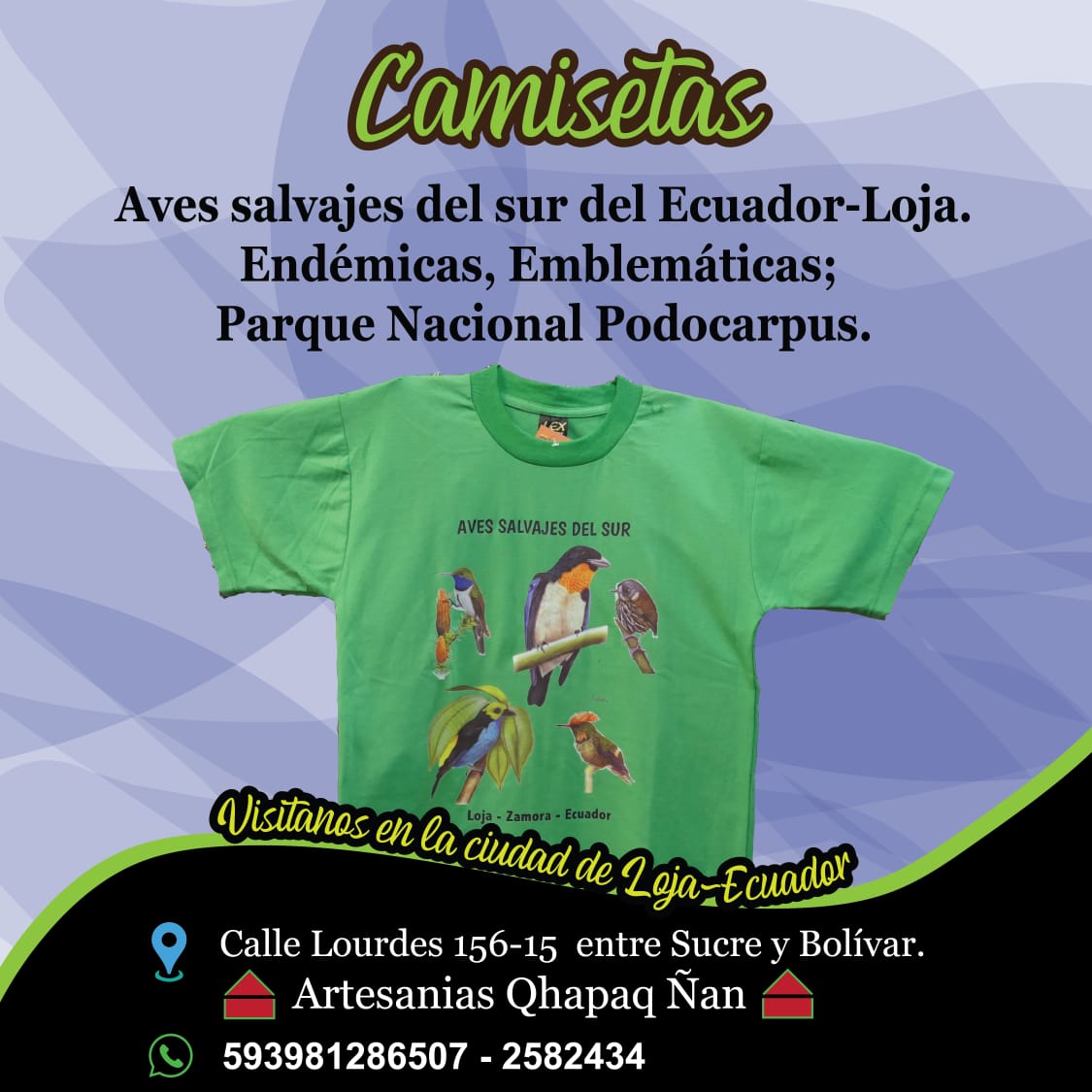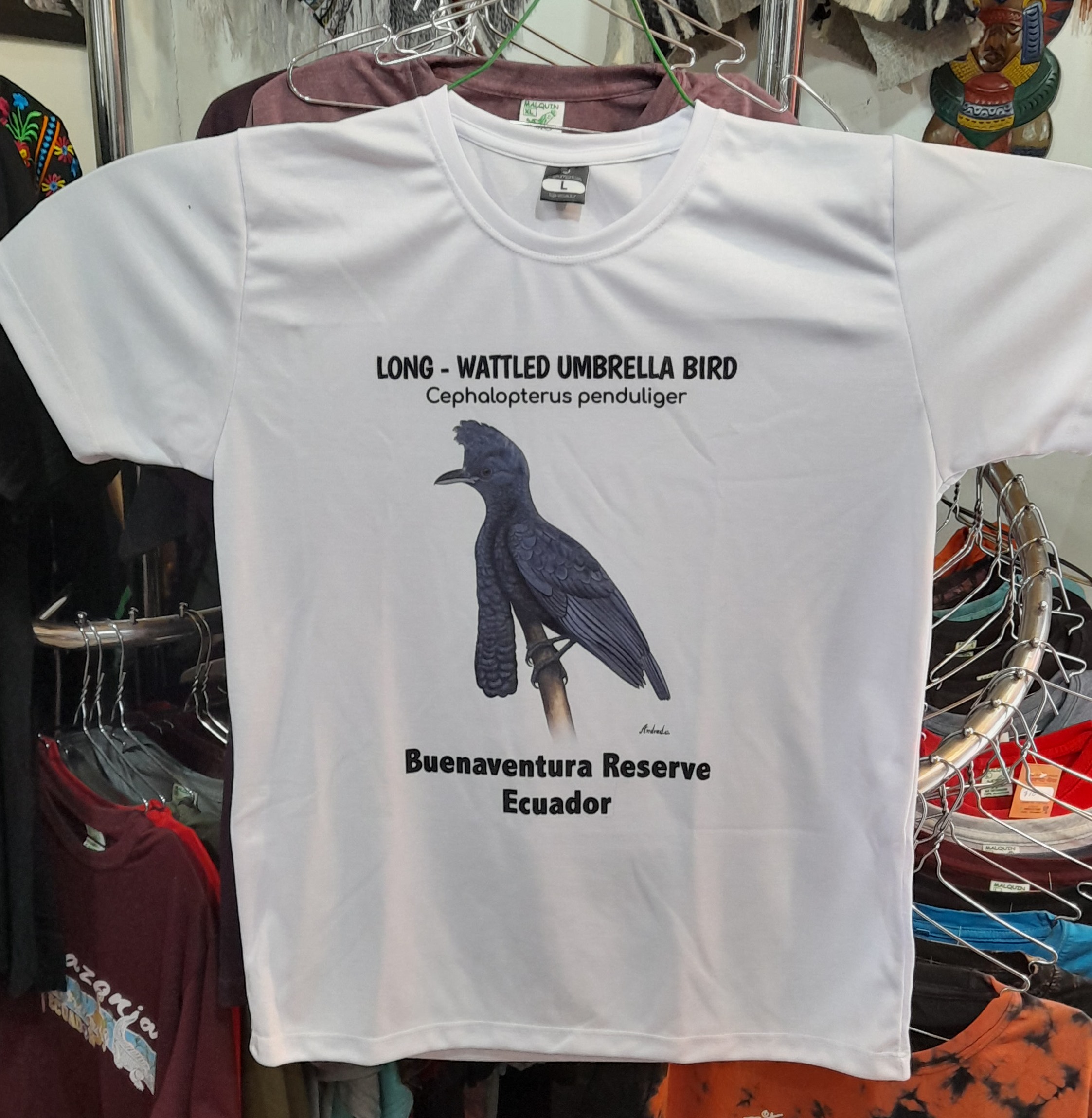 T-shirts printed with original illustrationes made By Pablo Andrade. We can custom designs with all the birds of the city of Loja as well as the wild birds of Southern Ecuador and Podocarpus National Park, endemics and emblematics such as the Blue-throated Hillstar, Long-wattled Umbrella Bird, Andean cock-of-the Rock, Orange-throated Tanager, Spangled Coquette, Crescent-faced Antpitta, Koepcke´s Screech Owl and many other amazing colorfull birds